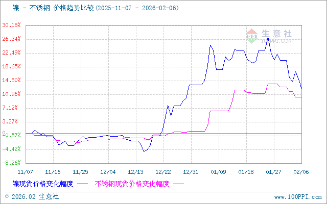 据生意社价差分析工具显示,镍和不锈钢价格走势相似,近期整体走势下跌。