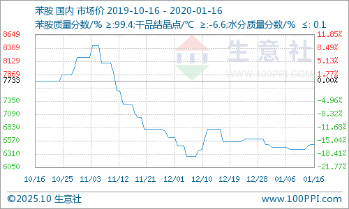 1月16日,山东地区苯胺价格在6400元/吨;南京地区苯胺价格6800元/吨。