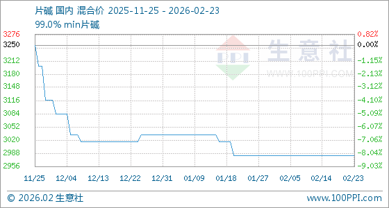 2月23日,生意社片碱基准价为2983.33元/吨,与本月初持平。