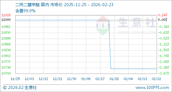 2月23日,生意社二丙二醇甲醚基准价为10733.33元/吨,与本月初持平。