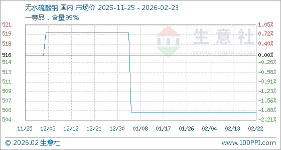 2月23日,生意社无水硫酸钠基准价为506.00元/吨,与本月初持平。