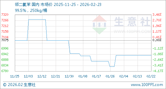 2月23日,生意社邻二氯苯基准价为6933.33元/吨,与本月初持平。