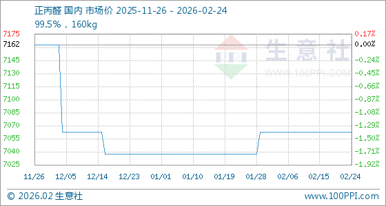 2月24日,生意社正丙醛基准价为7062.50元/吨,与本月初持平。