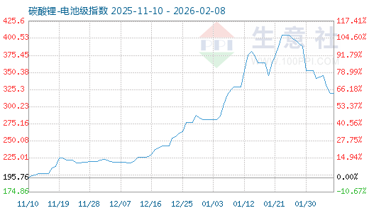 2月8日生意社碳酸锂-电池级指数为320.00,与昨日持平,较周期内最高点1432.94点(2022-11-13)下降了77.67%,较2014年01月23日最低点97.25点上涨了229.05%。(注:周期指2013-09-01至今)