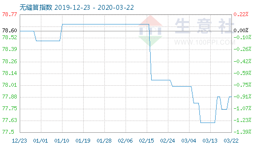3月22日无缝管商品指数为77.89,与昨日持平,较周期内最高点101.31点(2017-12-25)下降了23.12%,较2016年01月03日最低点42.62点上涨了82.75%。(注:周期指2011-09-01至今)