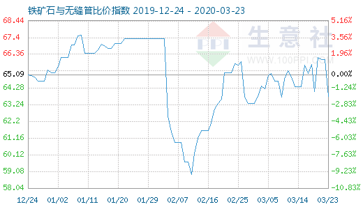 3月23日铁矿石与无缝管商品比价指数为63.76,较昨日下降了2.28点,较周期内最高点105.07点(2013-01-08)下降了39.32%,较2017年11月01日最低点37.83点上涨了68.54%。(注:周期指2013-01-01至今)