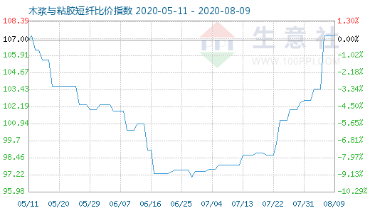 据生意社数据,当天木浆参考价为3577.50,自2020/7/22起,19天陆续上涨了1.346%。当天下游商品粘胶短纤参考价为8700.00,自2020/6/11起,60天陆续下降了9.104%。