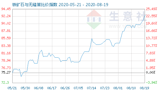 据生意社数据,当天铁矿石参考价为950.11,自2020/8/12起,8天陆续上涨了5.01%。当天下游商品无缝管参考价为4405.00,自2020/8/5起,15天陆续上涨了1.323%。