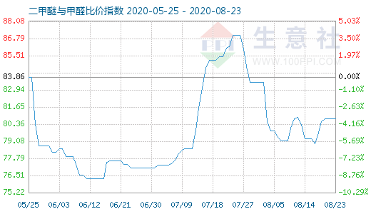 8月23日二甲醚与甲醛商品比价指数为80.78,与昨日持平,较周期内最高点105.30点(2013-12-10)下降了23.29%,较2019年03月26日最低点62.35点上涨了29.56%。(注:周期指2012-01-01至今)