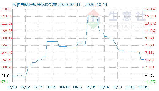 10月11日木浆与粘胶短纤商品比价指数为102.74,与昨日持平,较周期内最高点117.10点(2019-03-25)下降了12.26%,较2019年08月09日最低点88.33点上涨了16.31%。(注:周期指2019-01-01至今)