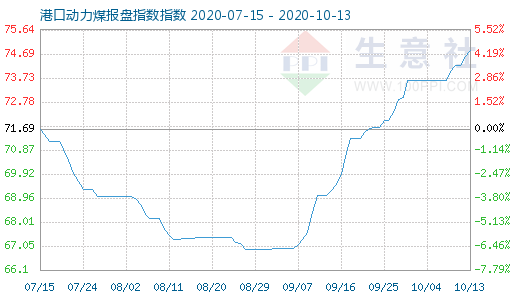 10月13日动力煤商品指数为74.85,较昨日上升了0.24点,较周期内最高点103.01点(2011-11-15)下降了27.34%,较2016年01月20日最低点44.70点上涨了67.45%。(注:周期指2011-09-01至今)