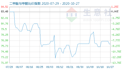 10月27日二甲醚与甲醛商品比价指数为76.22,与昨日持平,较周期内最高点105.30点(2013-12-10)下降了27.62%,较2019年03月26日最低点62.35点上涨了22.25%。(注:周期指2012-01-01至今)