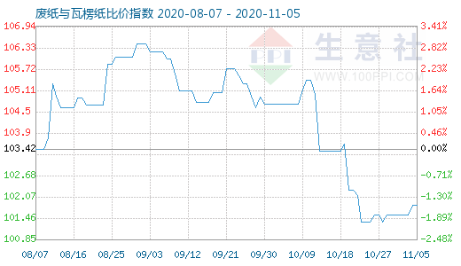 11月5日废纸与瓦楞纸商品比价指数为101.83,与昨日持平,较周期内最高点109.80点(2019-05-07)下降了7.26%,较2020年03月30日最低点80.50点上涨了26.50%。(注:周期指2019-01-01至今)