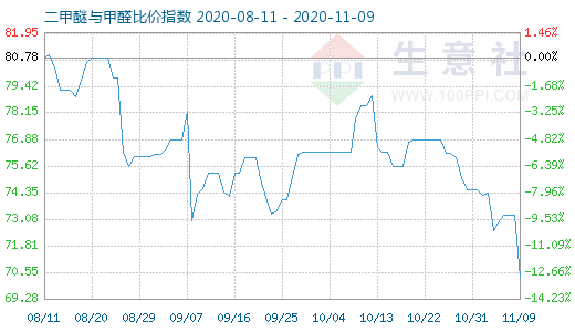 11月9日二甲醚与甲醛商品比价指数为70.34,较昨日下降了2.93点,较周期内最高点105.30点(2013-12-10)下降了33.20%,较2019年03月26日最低点62.35点上涨了12.81%。(注:周期指2012-01-01至今)