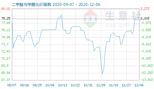 12月6日二甲醚与甲醛商品比价指数为78.53,与昨日持平,较周期内最高点105.30点(2013-12-10)下降了25.42%,较2019年03月26日最低点62.35点上涨了25.95%。(注:周期指2012-01-01至今)