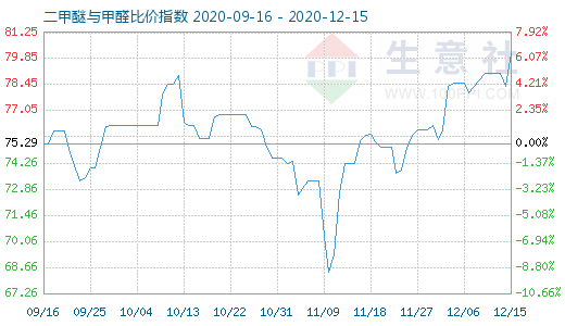 12月15日二甲醚与甲醛商品比价指数为80.09,较昨日上升了1.74点,较周期内最高点105.30点(2013-12-10)下降了23.94%,较2019年03月26日最低点62.35点上涨了28.45%。(注:周期指2012-01-01至今)