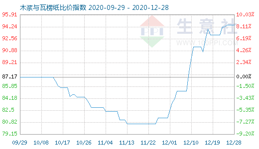 据生意社数据,当天木浆参考价为4087.50,自2020/11/25起,34天陆续上涨了15.141%。当天下游商品瓦楞纸参考价为3385.00,自2020/12/14起,15天陆续上涨了1.652%。