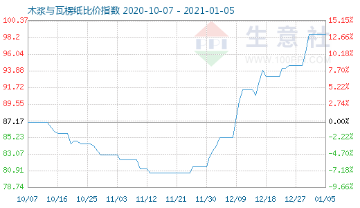 据生意社数据,当天木浆参考价为4262.50,自2020/11/25起,42天陆续上涨了20.07%。当天下游商品瓦楞纸参考价为3385.00,自2020/12/14起,23天陆续上涨了1.652%。