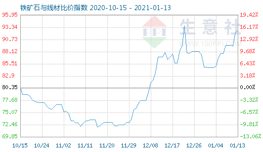1月13日铁矿石与线材比价指数为92.64