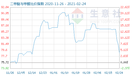 2月24日二甲醚与甲醛商品比价指数为78.71,较昨日下降了2.69点,较周期内最高点105.30点(2013-12-10)下降了25.25%,较2019年03月26日最低点62.35点上涨了26.24%。(注:周期指2012-01-01至今)
