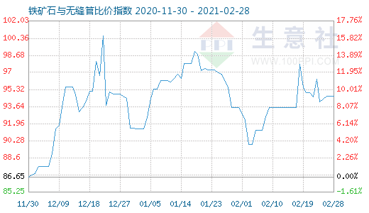 2月28日铁矿石与无缝管商品比价指数为94.68,与昨日持平,较周期内最高点105.07点(2013-01-08)下降了9.89%,较2017年11月01日最低点37.83点上涨了150.28%。(注:周期指2013-01-01至今)