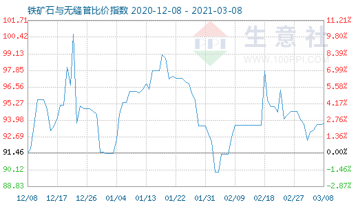 3月8日铁矿石与无缝管比价指数为93.69