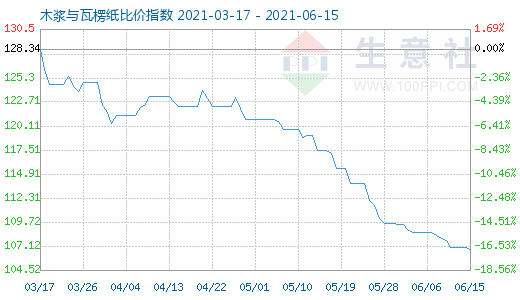 6月15日木浆与瓦楞纸商品比价指数为106.69,较昨日下降了0.27点,较周期内最高点128.34点(2021-03-17)下降了16.87%,较2020年03月15日最低点76.30点上涨了39.83%。(注:周期指2017-01-01至今)
