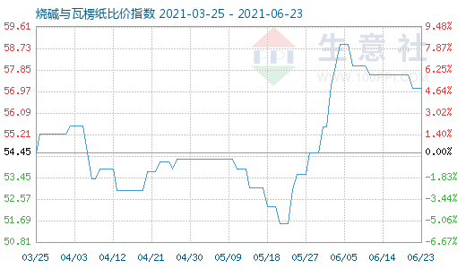 6月23日烧碱与瓦楞纸比价指数为57.11