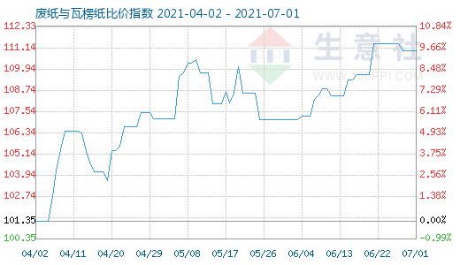 7月1日废纸与瓦楞纸商品比价指数为110.97,与昨日持平,较周期内最高点114.03点(2021-01-18)下降了2.68%,较2020年03月30日最低点80.50点上涨了37.85%。(注:周期指2019-01-01至今)