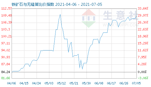 7月5日铁矿石与无缝管商品比价指数为109.40,较昨日上升了1.2点,较周期内最高点110.00点(2021-05-11)下降了0.55%,较2017年11月01日最低点37.83点上涨了189.19%。(注:周期指2013-01-01至今)