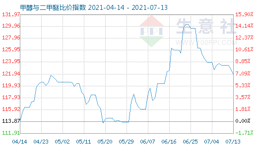 7月13日甲醇与二甲醚商品比价指数为121.86,较昨日下降了0.88点,较周期内最高点130.38点(2016-12-12)下降了6.53%,较2018年11月30日最低点90.06点上涨了35.31%。(注:周期指2012-01-01至今)