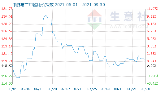 8月30日甲醇与二甲醚商品比价指数为119.98,较昨日下降了0.35点,较周期内最高点130.38点(2016-12-12)下降了7.98%,较2018年11月30日最低点90.06点上涨了33.22%。(注:周期指2012-01-01至今)