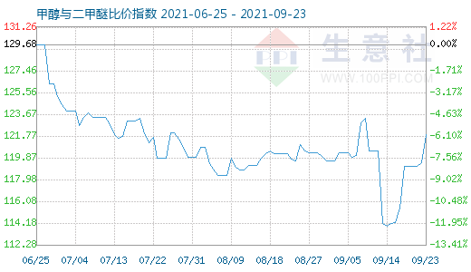 9月23日甲醇与二甲醚商品比价指数为121.86,较昨日上升了2.38点,较周期内最高点130.38点(2016-12-12)下降了6.53%,较2018年11月30日最低点90.06点上涨了35.31%。(注:周期指2012-01-01至今)
