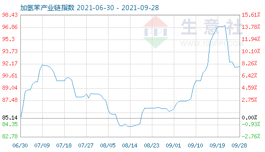 9月28日加氢苯产业链指数为91.83,较昨日上升了0.07点,较周期内最高点102.02点(2013-12-24)下降了9.99%,较2020年04月06日最低点33.51点上涨了174.04%。(注:周期指2013-12-01至今)