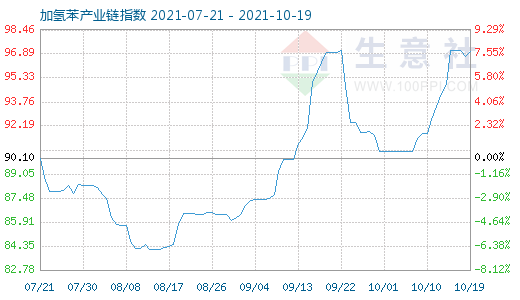 10月19日加氢苯产业链指数为97.08,较昨日上升了0.32点,较周期内最高点102.02点(2013-12-24)下降了4.84%,较2020年04月06日最低点33.51点上涨了189.70%。(注:周期指2013-12-01至今)