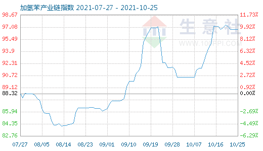 10月25日加氢苯产业链指数为96.79,较昨日下降了0.02点,较周期内最高点102.02点(2013-12-24)下降了5.13%,较2020年04月06日最低点33.51点上涨了188.84%。(注:周期指2013-12-01至今)