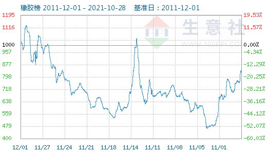 橡胶指数自2021/10/21起,8天陆续下降了1.669%。