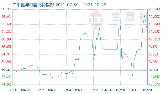 据生意社数据,当天二甲醚参考价为5317.50,自2021/10/13起,16天陆续下降了15.762%。当天下游商品甲醛参考价为1766.67,自2021/10/14起,15天陆续下降了22.059%。