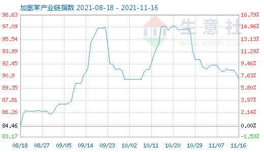 加氢苯产业链指数自2021/10/20起,28天陆续下降了7.047%。