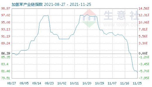 加氢苯产业链指数自2021/10/20起,37天陆续下降了16.651%。