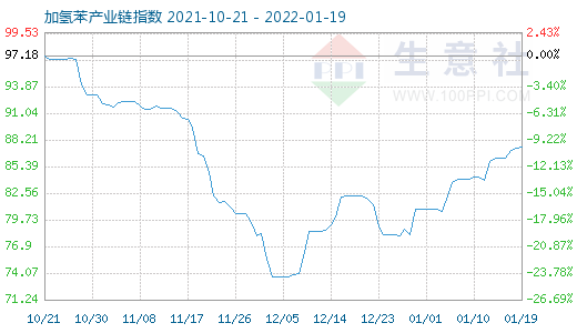1月19日加氢苯产业链指数为87.41,较昨日上升了0.1点,较周期内最高点102.02点(2013-12-24)下降了14.32%,较2020年04月06日最低点33.51点上涨了160.85%。(注:周期指2013-12-01至今)