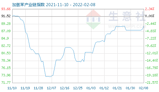 2月8日加氢苯产业链指数为88.63,较昨日上升了0.95点,较周期内最高点102.02点(2013-12-24)下降了13.12%,较2020年04月06日最低点33.51点上涨了164.49%。(注:周期指2013-12-01至今)