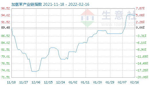 2月16日加氢苯产业链指数为94.11,较昨日上升了0.04点,较周期内最高点102.02点(2013-12-24)下降了7.75%,较2020年04月06日最低点33.51点上涨了180.84%。(注:周期指2013-12-01至今)