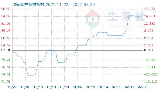 加氢苯产业链指数自2022/2/13起,8天陆续下降了1.398%。