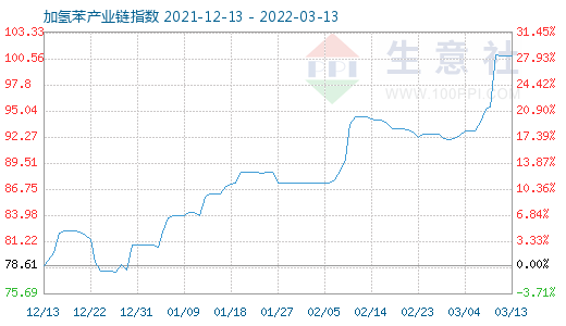 3月13日加氢苯产业链指数为100.80,与昨日持平,较周期内最高点102.02点(2013-12-24)下降了1.20%,较2020年04月06日最低点33.51点上涨了200.81%。(注:周期指2013-12-01至今)