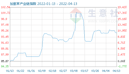 4月13日加氢苯产业链指数为94.72,较昨日下降了0.02点,较周期内最高点102.02点(2013-12-24)下降了7.16%,较2020年04月06日最低点33.51点上涨了182.66%。(注:周期指2013-12-01至今)