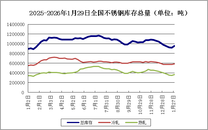 1月不锈钢库存先跌后涨。截止月底,不锈钢库存合计95.26万吨,较月初上涨0.46%。