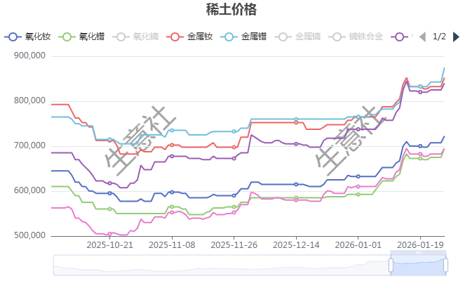 国内氧化钕、金属钕、氧化镨、金属镨、镨钕合金和镨钕氧化物价格均走势上涨,截止26日氧化钕价格为72.25万元/吨,5日价格上涨2.21%;金属钕价格为85.25万元/吨,5日价格上涨2.40%;氧化镨价格为69.5万元/吨,5日价格上涨2.96%;金属镨价格为87.5万元/吨,价格走势上涨3.86%;镨钕合金价格为84万元/吨,价格上涨1.82%;镨钕氧化物价格为69.5万元/吨,价格上涨1.83%。