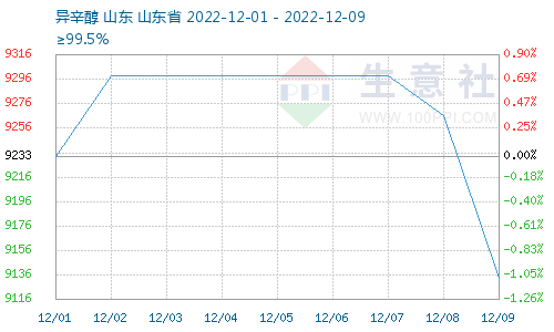 据生意社价格监测,截止12月9日,异辛醇价格9133.33元/吨,较12月1日异辛醇价格9233.33元/吨下跌,跌幅1.08%。异辛醇开工震荡调整,增塑剂需求低迷,异辛醇价格弱势下跌,DOP成本下降。