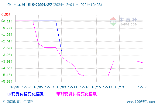 据生意社商品行情分析系统,截止12月23日,邻二甲苯报价6700元/吨,较12月16日邻二甲苯价格6700元/吨暂稳;较12月1日邻二甲苯价格6900元/吨震荡下跌,跌幅2.90%。本周邻苯价格暂稳,邻法苯酐成本趋稳,邻法苯酐下跌压力减弱。工业萘价格趋稳,奈法苯酐成本趋稳。总体苯酐原材料成本下跌压力减弱,苯酐价格下跌压力减弱。